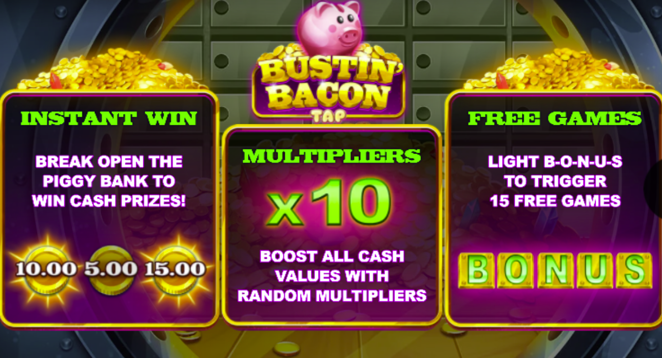 Bustin Bacon Tap delivers an arcade-style, tap-to-win experience: instead of spinning reels, you break open a piggy bank with a slingshot. The game offers multipliers, free-spin rounds, and a potential max payout of 1,950? your bet. :contentReference[oaicite:10]{index=10}
