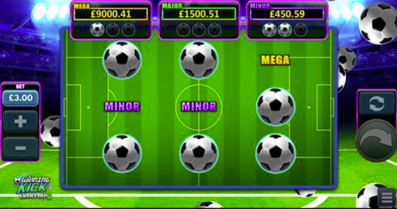 Instead of spinning reels, a ball lands in one of three squares. If it lands in the centre, you get a shot on goal success gives you a set of prizes. :contentReference[oaicite:5]{index=5}